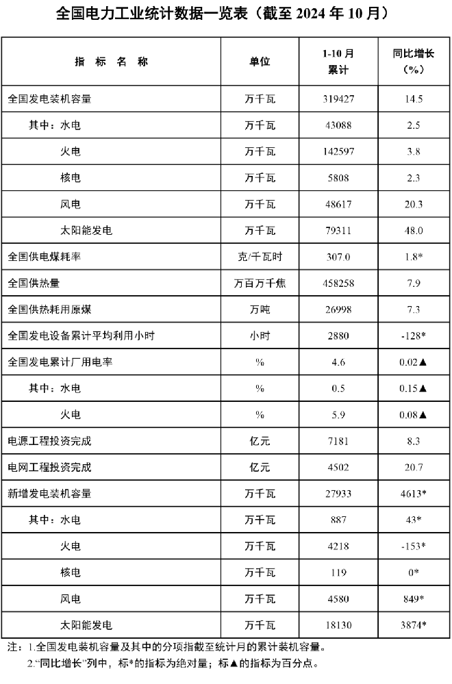 11月22日,國家能源局發布1-10月份全國電力工業統計數據。