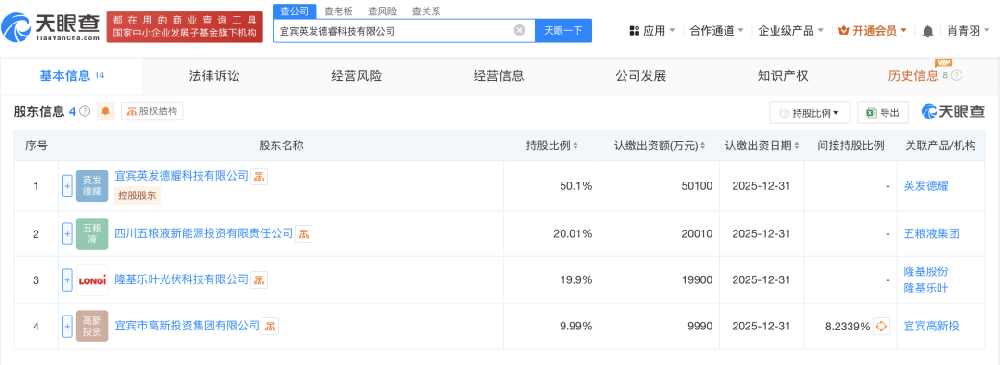 據天眼查顯示,該公司有四大股東,分別是宜賓英發德耀科技有限公司、四川五糧液新能源投資有限責任公司、隆基樂葉光伏科技有限公司以及地方國企宜賓市高新投資集團有限公司。