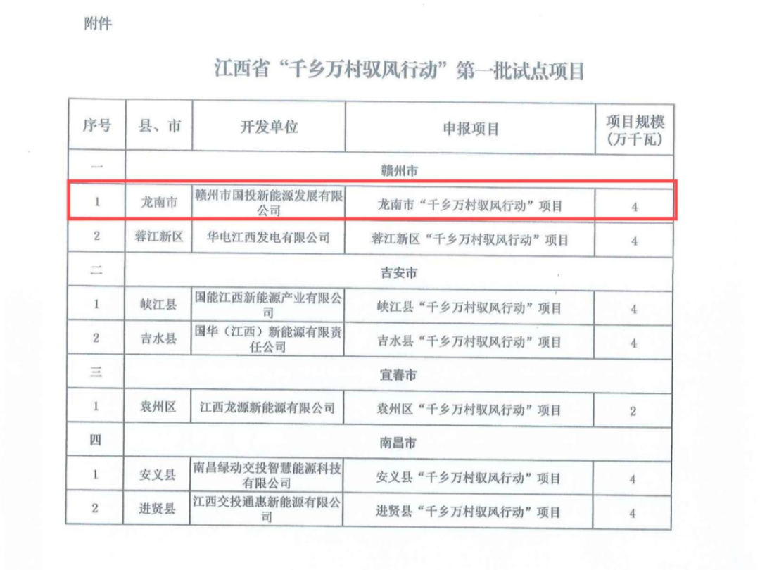 近日,江西省發展改革委、江西省能源局、江西省農業農村廳聯合發布《關于下達江西省“千鄉萬村馭風行動”第一批試點項目的通知》(贛發改能源〔2025〕290號)。《通知》正式公布全省首批7個試點縣(市、區)風電項目,總容量為260MW。