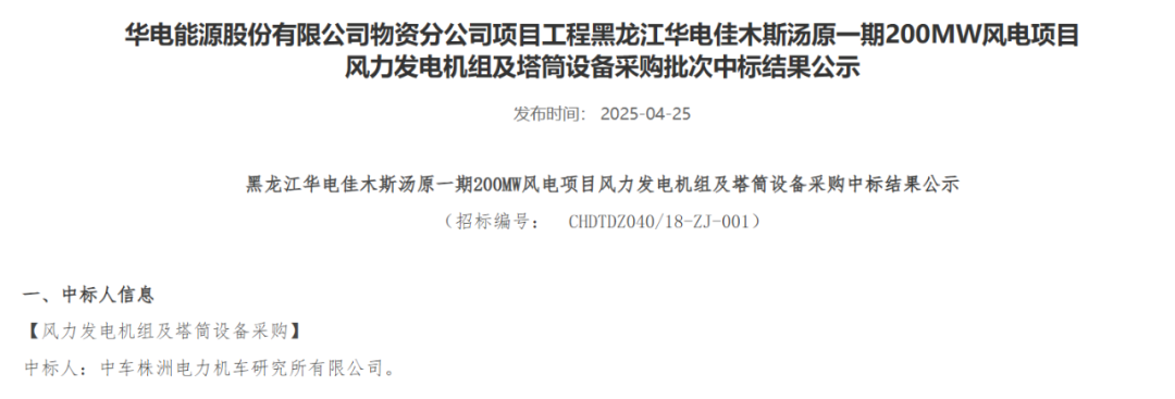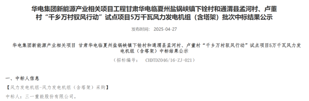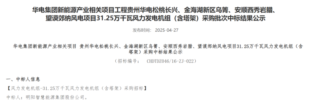 近日,華電集團(tuán)電子商務(wù)平臺(tái)發(fā)布重慶華電奉節(jié)高橋7.5萬(wàn)千瓦風(fēng)電項(xiàng)目、黑龍江華電佳木斯湯原一期200MW風(fēng)電項(xiàng)目、內(nèi)蒙古華電孿井灘60萬(wàn)千瓦風(fēng)光制氫一體化項(xiàng)目配套40萬(wàn)千瓦風(fēng)電項(xiàng)目、云南華電紅河開(kāi)遠(yuǎn)大黑山擴(kuò)建19.5萬(wàn)千瓦風(fēng)電項(xiàng)目、黑龍江華電黑河北安建華20萬(wàn)千瓦風(fēng)電項(xiàng)目、貴州華電松桃長(zhǎng)興、金海湖新區(qū)烏箐、安順西秀巖臘、望謨郊納風(fēng)電項(xiàng)目31.25萬(wàn)千瓦、甘肅華電臨夏州鹽鍋峽鎮(zhèn)下銓村和通渭縣孟河村、盧董村“千鄉(xiāng)萬(wàn)村馭風(fēng)行動(dòng)”試點(diǎn)項(xiàng)目5萬(wàn)千瓦風(fēng)力發(fā)電機(jī)組采購(gòu)中標(biāo)結(jié)果公示的公告。