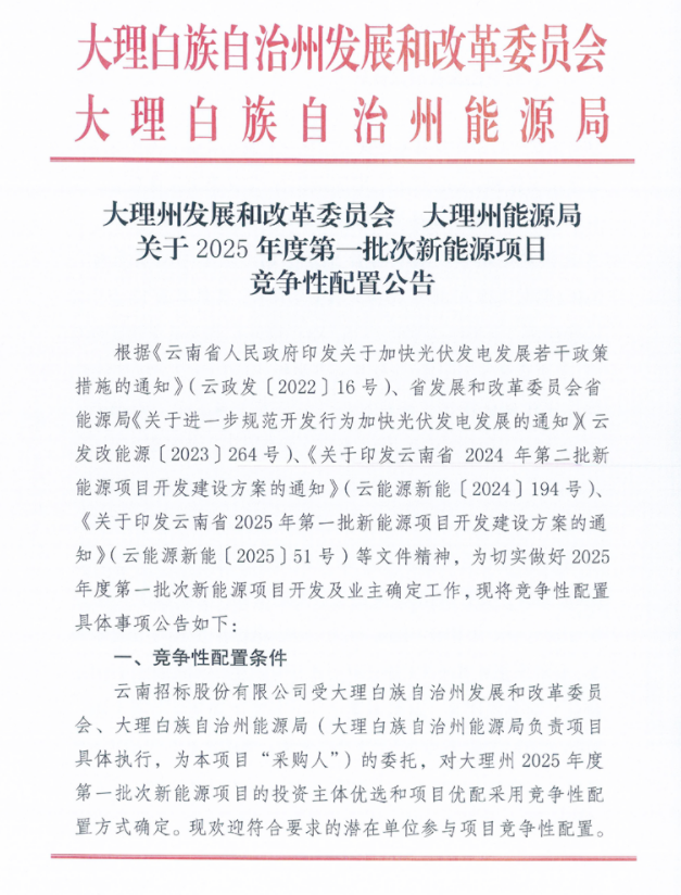 7月29日,云南省大理州發展和改革委員會 大理州能源局發布《關于2025年度第一批次新能源項目競爭性配置公告》。