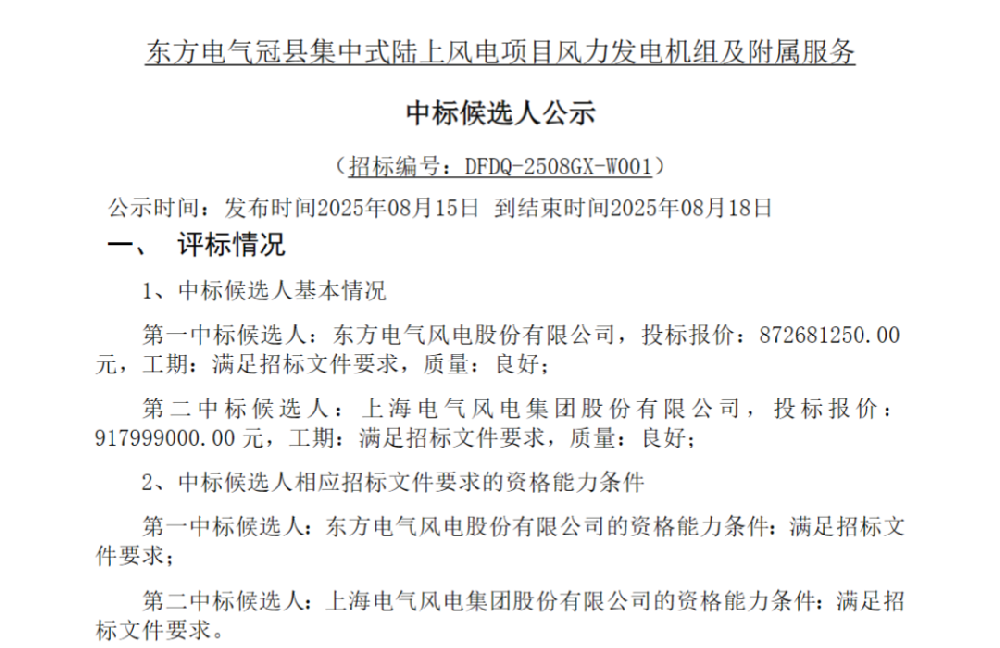 公告顯示,第一中標候選人:東方電氣風電股份有限公司,投標報價:872681250.00元。第二中標候選人:上海電氣風電集團股份有限公司,投標報價:917999000.00元。