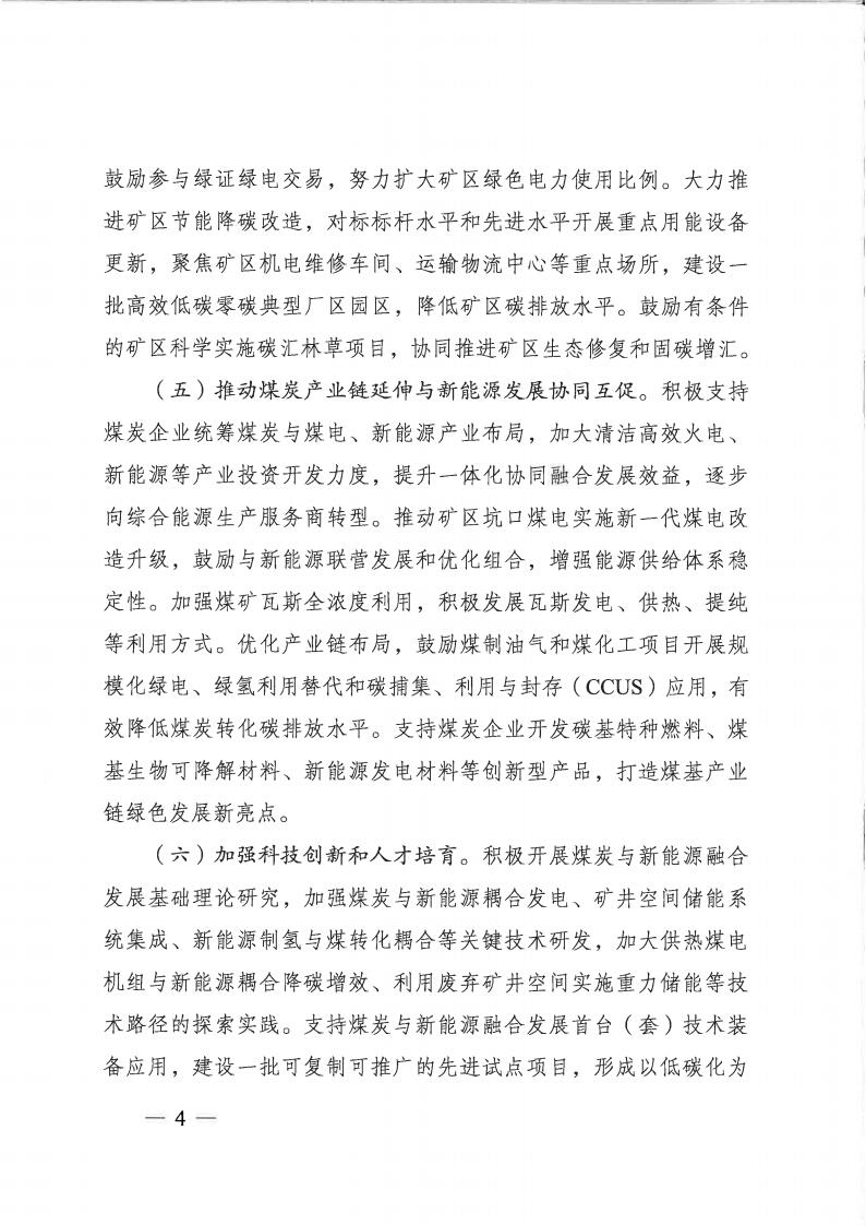 推動煤炭產業鏈延伸與新能源發展協同互促。積極支持煤炭企業統籌煤炭與煤電、新能源產業布局,加大清潔高效火電、新能源等產業投資開發力度,提升一體化協同融合發展效益,逐步向綜合能源生產服務商轉型。推動礦區坑口煤電實施新一代煤電改造升級,鼓勵與新能源聯營發展和優化組合,增強能源供給體系穩定性。加強煤礦瓦斯全濃度利用,積極發展瓦斯發電、供熱、提純等利用方式。優化產業鏈布局,鼓勵煤制油氣和煤化工項目開展規模化綠電、綠氫利用替代和碳捕集、利用與封存(CCUS)應用,有效降低煤炭轉化碳排放水平。支持煤炭企業開發碳基特種燃料、煤基生物可降解材料、新能源發電材料等創新型產品,打造煤基產業鏈綠色發展新亮點。