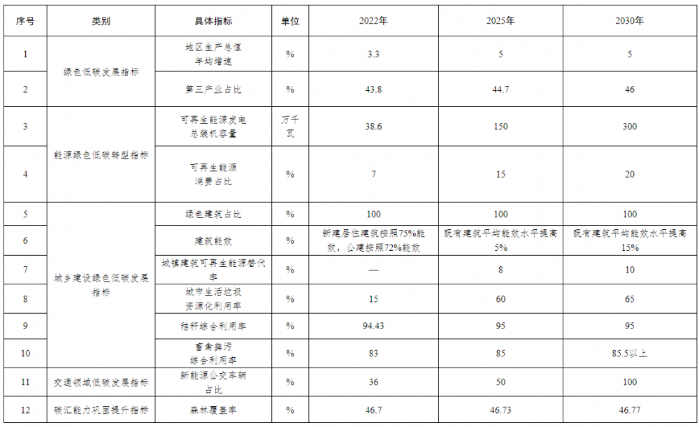 到2025年,產業結構和能源結構調整優化取得明顯成效,能源資源利用效率持續提高,綠色低碳技術研發和推廣應用取得新進展,綠色生產生活方式得到普遍推行,綠色低碳循環發展政策體系初步建立。可再生能源發電總裝機容量達到150萬千瓦,公共交通新能源公交車輛占比達到50%,森林覆蓋率達到46.73%,單位地區生產總值能源消耗和二氧化碳排放下降,確保完成省下達目標任務。到2030年,產業結構調整取得重大進展,重點領域低碳發展模式基本形成,清潔低碳、安全高效的能源體系初步建立,非化石能源消費比重進一步提高,綠色生活方式成為公眾自覺選擇,綠色低碳循環發展政策體系基本健全,綠色低碳發展水平明顯提升。可再生能源消費占比達到20%,單位地區生產總值能源消耗和二氧化碳排放下降,確保完成省下達目標任務,按期實現碳達峰目標。
