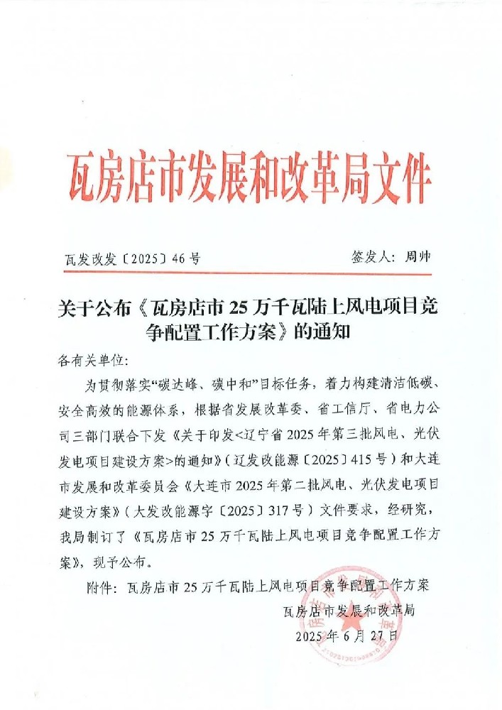 為貫徹落實“碳達峰、碳中和”目標任務,著力構建清潔低碳、安全高效的能源體系,根據省發展改革委、省工信廳、省電力公司三部門聯合下發《關于印發<遼寧省2025年第三批風電、光伏發電項目建設方案>的通知》(遼發改能源〔2025〕415號)和大連市發展和改革委員會《大連市2025年第二批風電、光伏發電項目建設方案》(大發改能源字〔2025〕317號)文件要求,經研究,我局制訂了《瓦房店市25萬千瓦陸上風電項目競爭配置工作方案》,現予公布。