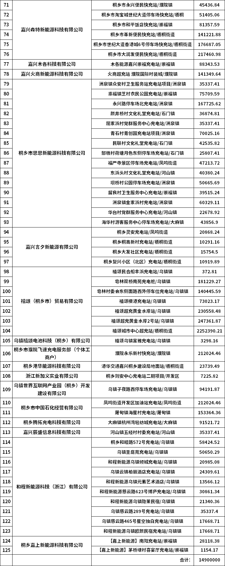 根據2024年度第二批新能源汽車充電基礎設施獎勵資金二次公示名單顯示,桐鄉市虎將安防工程有限公司、嘉興輝煌建筑材料有限公司、嘉興曉程新能源科技有限公司、桐鄉桐越充電服務有限公司、嘉興市哥譚充電服務有限公司、桐鄉紫浩充電服務有限公司、桐鄉市極能新能源有限公司、嘉興聚明新能源科技有限公司、星派(嘉興)能源科技有限公司、桐鄉市電小圈充電服務有限公司、桐鄉市綠巨人能源科技有限公司等44家企業,125座充電站獲獎補資金。